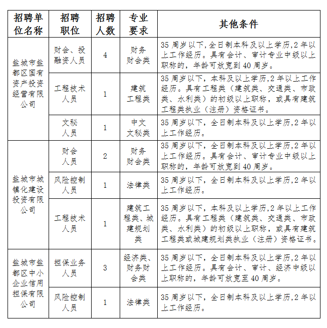 根據工作需要,鹽城市鹽都區(qū)財政局直屬國有企業(yè)鹽城市鹽都區(qū)國有資產投資經營有限公司、鹽城市城鎮(zhèn)化建設投資有限公司、鹽城市鹽都區(qū)中小企業(yè)信用擔保有限公司決定面向社會公開招聘工作人員?,F(xiàn)將有關事項公告如下: