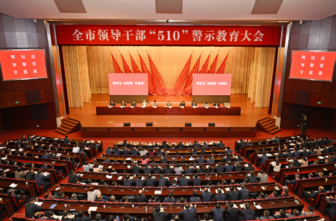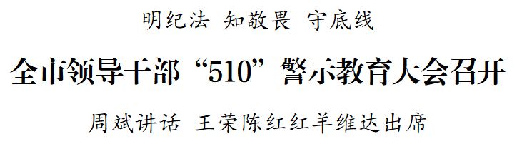 5月10日,市委召開全市領導干部“510”警示教育大會,深入學習貫徹黨的二十大和習近平總書記參加江蘇代表團審議時重要講話精神,全面落實中央和省委部署,通過以案明紀、警鐘長鳴,推動各級黨員干部真正做到自重自省、自警自勵,永葆忠誠、干凈、擔當?shù)恼伪旧?,為全面推進中國式現(xiàn)代化鹽城新實踐開好局、起好步提供堅強政治保證。市委書記周斌出席并講話。市人大常委會主任王榮、市政協(xié)主席陳紅紅出席,市委副書記、統(tǒng)戰(zhàn)部部長羊維達主持。