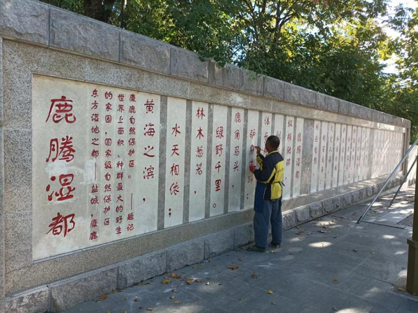 潤都公園主入口的特色浮雕景墻上嵌有“鶴舞東方”、“鹿騰濕都”等字樣,設(shè)計(jì)方案充分融入鹽城地方元素,以“鶴”、“鹿” 為主題,結(jié)合優(yōu)雅靈動(dòng)的浮雕畫,突出鹽城濕地廣闊、物種豐富、生態(tài)良好的特點(diǎn),充分體現(xiàn)了鹽城自然環(huán)境的優(yōu)越性。 美景共賞,更需要共同去維護(hù)。近日,公園工作人員對東門入口特色浮雕景墻和北門入口景觀石進(jìn)行清洗打磨、破損修復(fù)、字樣出新等處理。翻新工作保護(hù)了經(jīng)自然侵蝕的磨損景觀,改變了長久以來暗淡的色彩,也提升了公園入口景觀效果。